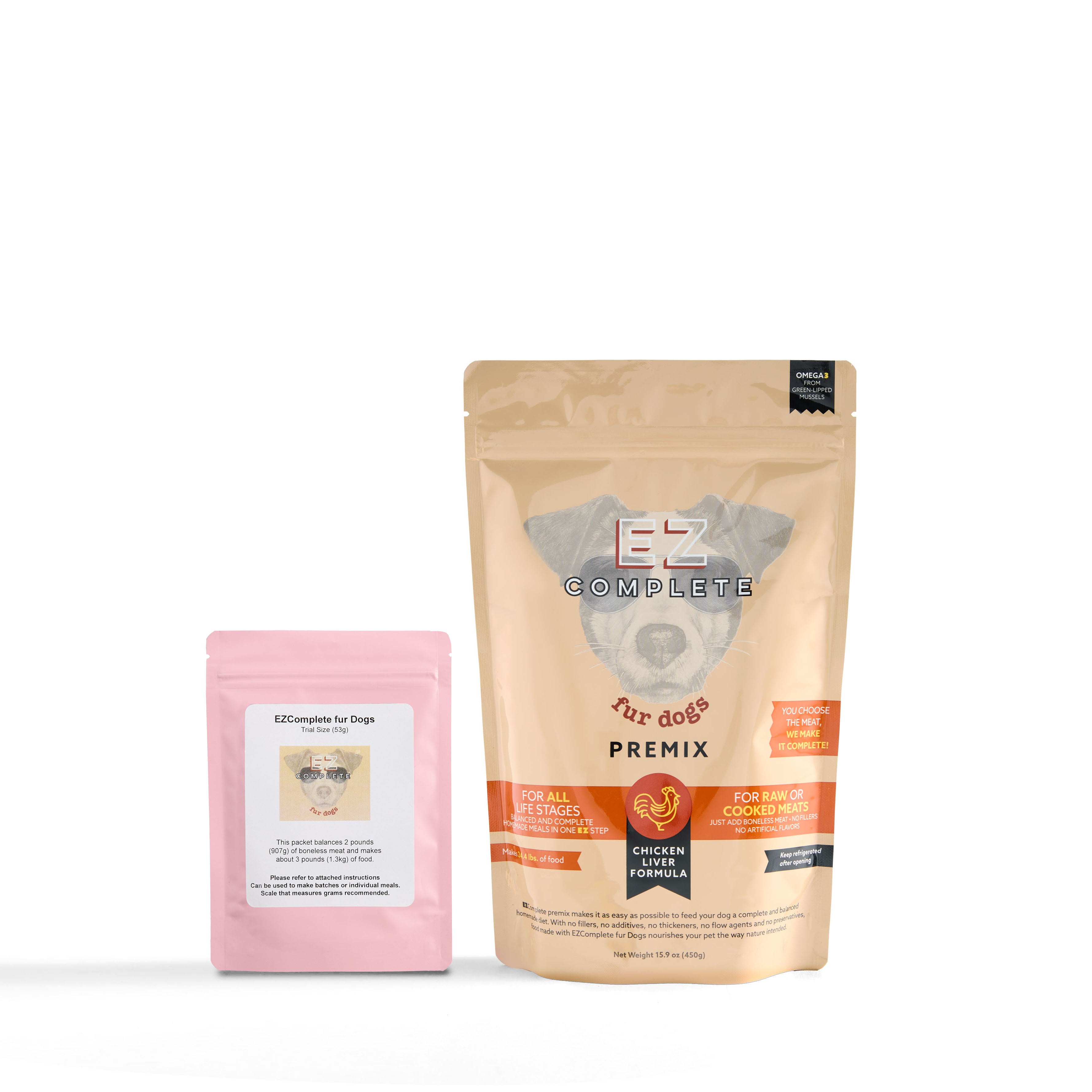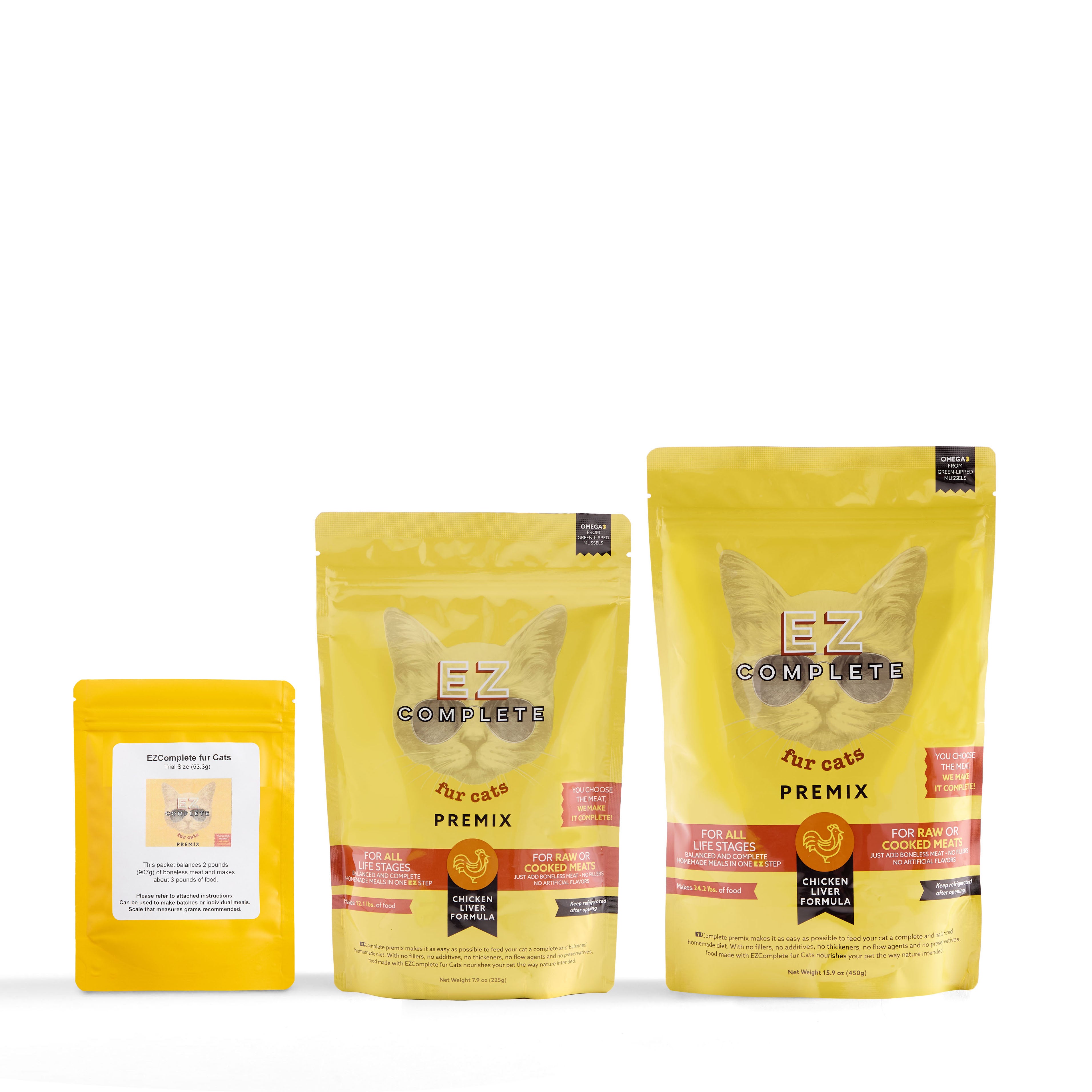 Trial size samples of EZComplete fur Dogs and Cats are available through the online store. Each trial size packet (EZComplete fur Cats and EZComplete fur Dogs) balances 2 pounds of meat.