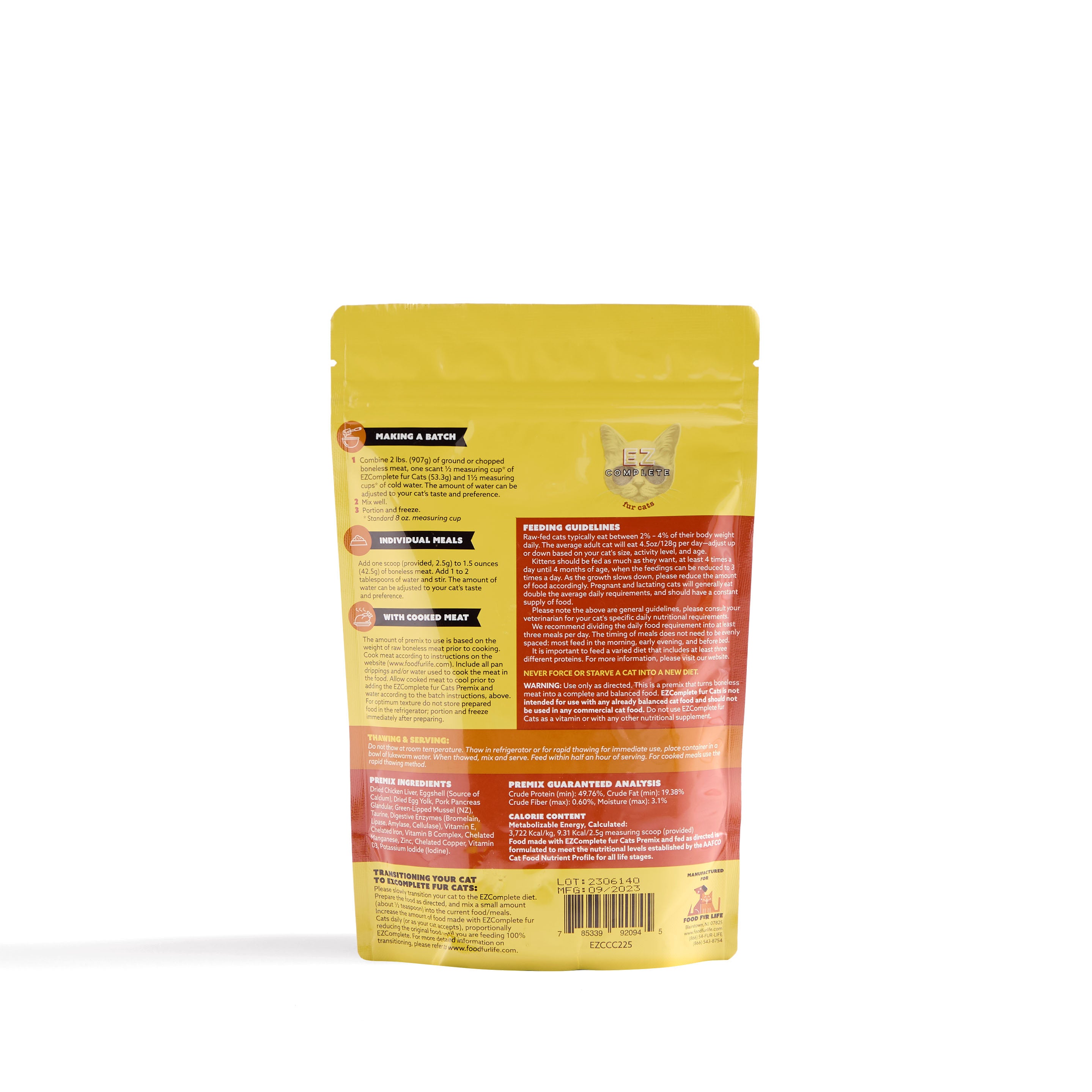Based on the prey model, EZComplete premixes contain liver and pancreas as the nutrient and enzyme-packed organs. For cats, we provide calcium carbonate as the source of calcium, lowering phosphorus compared to a diet with bone. This also eliminates a potential source of highly pathogenic avian flu versus using eggshell, which does not require heat treatment or pasteurization (as does egg yolk). Thus, cats with insufficient kidney function can enjoy the benefits of a balanced homemade diet; yet we've formulated our premix to ensure it meets the needs of kittens, pregnant cats, and nursing moms, too. Egg yolk, a true nutritional powerhouse, is rich in choline and vitamin E, and also brings almost every nutrient your pet needs. New Zealand green-lipped mussels provide a unique combination of antioxidants, anti-inflammatory omega-3s, and are rich in glucosamine and chondroitin, important in joint health. Digestive enzymes bring many benefits, reducing organ stress, improving digestion, and increasing nutrient utilization. Digestive enzymes are an important inclusion, especially for those who opt to cook the meat (and Food Fur Life recommends cooking all poultry products), as cooking eliminates the naturally occurring enzymes in the meat. The food ingredients provide the bulk of the nutrition in EZComplete premixes, though we do include a few vitamins and minerals to account for what is missing by not feeding whole prey. Above all, you supply the fresh, truly human grade meat. You control the primary ingredient in your pet’s natural diet – and Food Fur Life provides the EZComplete premix that makes it balanced and complete in just one easy step.
